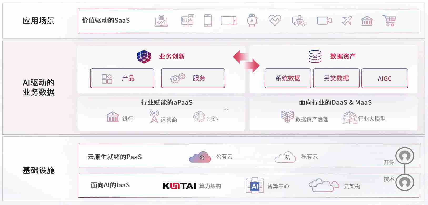 数字时代,,围绕企业数字化转型的关键要素,,,大奖888数码开创性的提出数云融合战略和技术体系框架,,,,着力在云原生、、数字原生、、AI原生和信创产业上架构产品和服务能力,,为处在不同数字化转型阶段的快消零售、、汽车、、、、金融、、、、医疗、、、政企、、、、教育、、运营商等行业客户提供泛在的敏捷IT能力和融合的数据驱动能力,,,构建跨界融合创新的数字业务场景和新业务模式,,助力企业级客户建立面向未来的核心能力和竞争优势,,全面推动社会的数字化、、智能化转型升级。。。